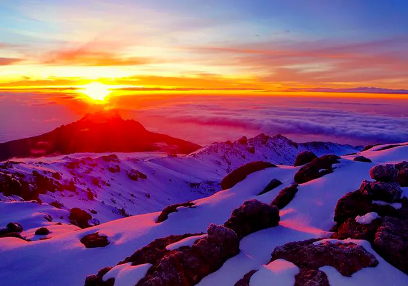 The most challenging and rewarding day of your journey starts with a midnight wake-up. After a light snack, you’ll begin the ascent under starlight, climbing through a steep and rocky path to Gilman’s Point on the crater rim. From here, you’ll witness a spectacular sunrise, with the sky lighting up above Africa’s highest peak. The final stretch to Uhuru Peak (5,895m) is challenging but incredibly rewarding, and upon reaching the summit, you’ll have a sense of achievement like no other. Take photos at the peak and soak in the panoramic views before beginning the descent back to Kibo Hut. After a rest and lunch, continue down to Horombo Hut for a well-deserved evening of rest.