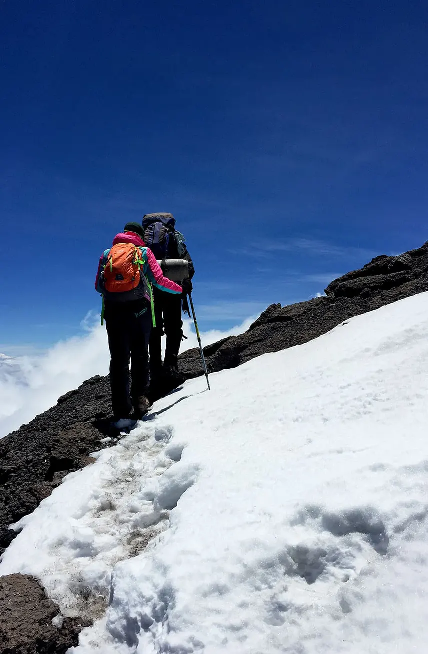 Today’s hike takes you further up through the heather and moorland zone, offering beautiful views of Kibo Peak and the surrounding landscape. The trail is a gradual ascent, giving you ample time to acclimate while taking in the expansive scenery. After 4-5 hours of trekking, you’ll reach Second Cave Camp (3,450m), where you’ll have the afternoon to rest, enjoy a hot meal, and prepare for the next day’s adventure